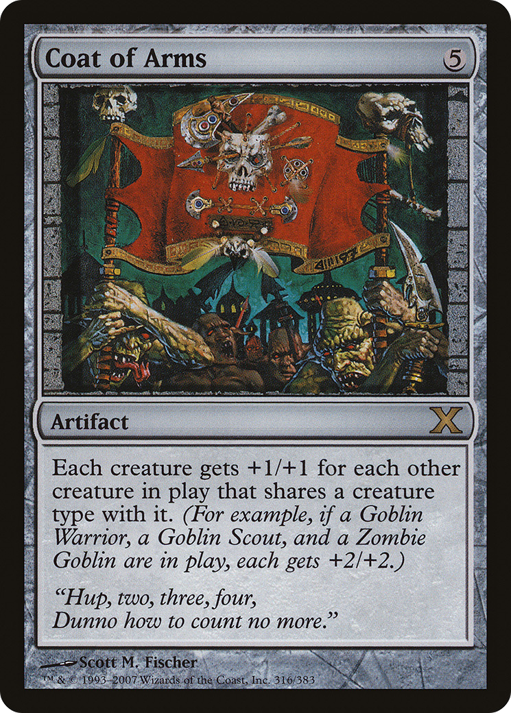 PredhEach creature gets +1/+1 for each other creature on the battlefield that shares at least one creature type with it. (For example, if two Goblin Warriors and a Goblin Shaman are on the battlefield, each gets +2/+2.)