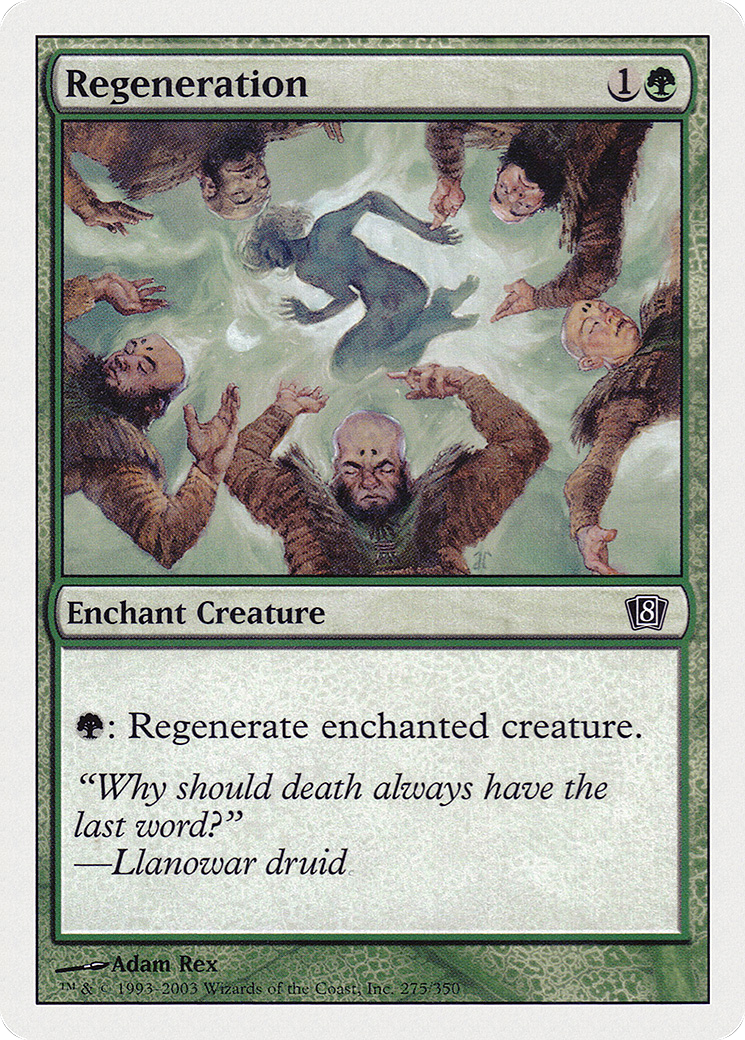 : Regenerate enchanted creature. (The next time that creature would be destroyed this turn, instead tap it, remove it from combat, and heal all damage on it.)