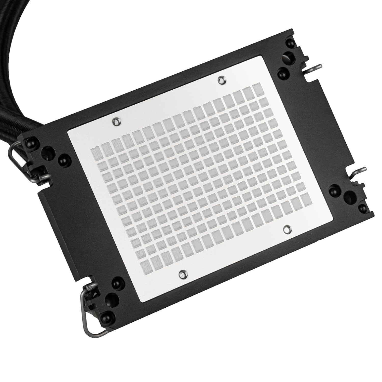The water block is constructed with nickel-plated copper, incorporated with a copper base active cooling surface to ensure full coverage of process cores on Sapphire Rapids-based CPUs.
