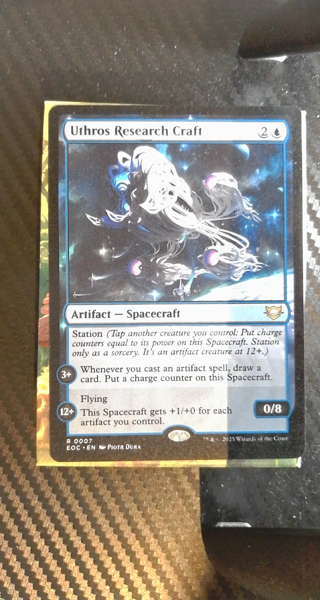 Station (Tap another creature you control: Put charge counters equal to its power on this Spacecraft. Station only as a sorcery. It's an artifact creature at 12+.) 3+ | Whenever you cast an artifact spell, draw a card. Put a charge counter on this Spacecraft. 12+ | Flying This Spacecraft gets +1/+0 for each artifact you control.